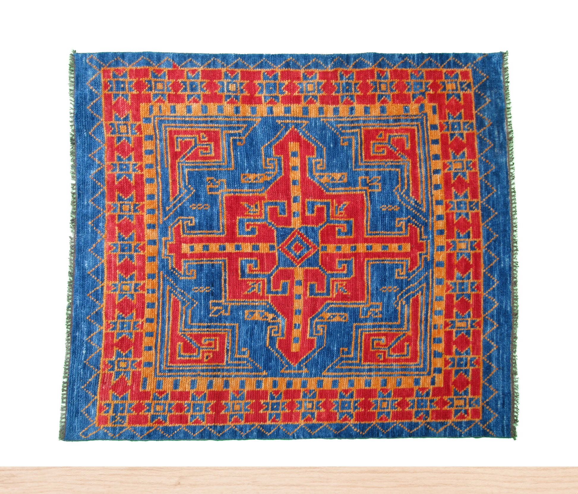 Handmade Tribal Design Rug - 5 x 5 Feet - Square Blue and Red Geometric Pattern