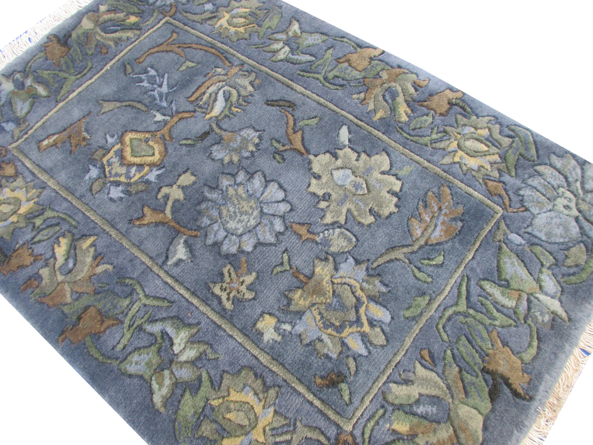 Add timeless elegance to your home with this beautifully crafted handmade wool floral area rug. Measuring 3.0 X 2.0 feet, this rug features a stunning blend of blue and earth-tone accents, offering a perfect combination of traditional design and modern appeal.