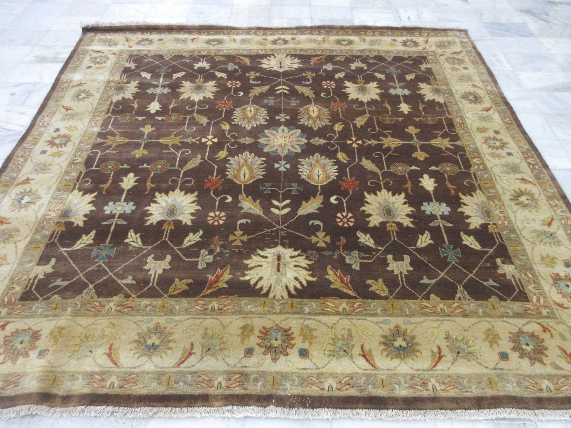 Vintage Floral Hand-Knotted Wool Rug - Brown & Beige (8x8) Feet | Timeless Elegance