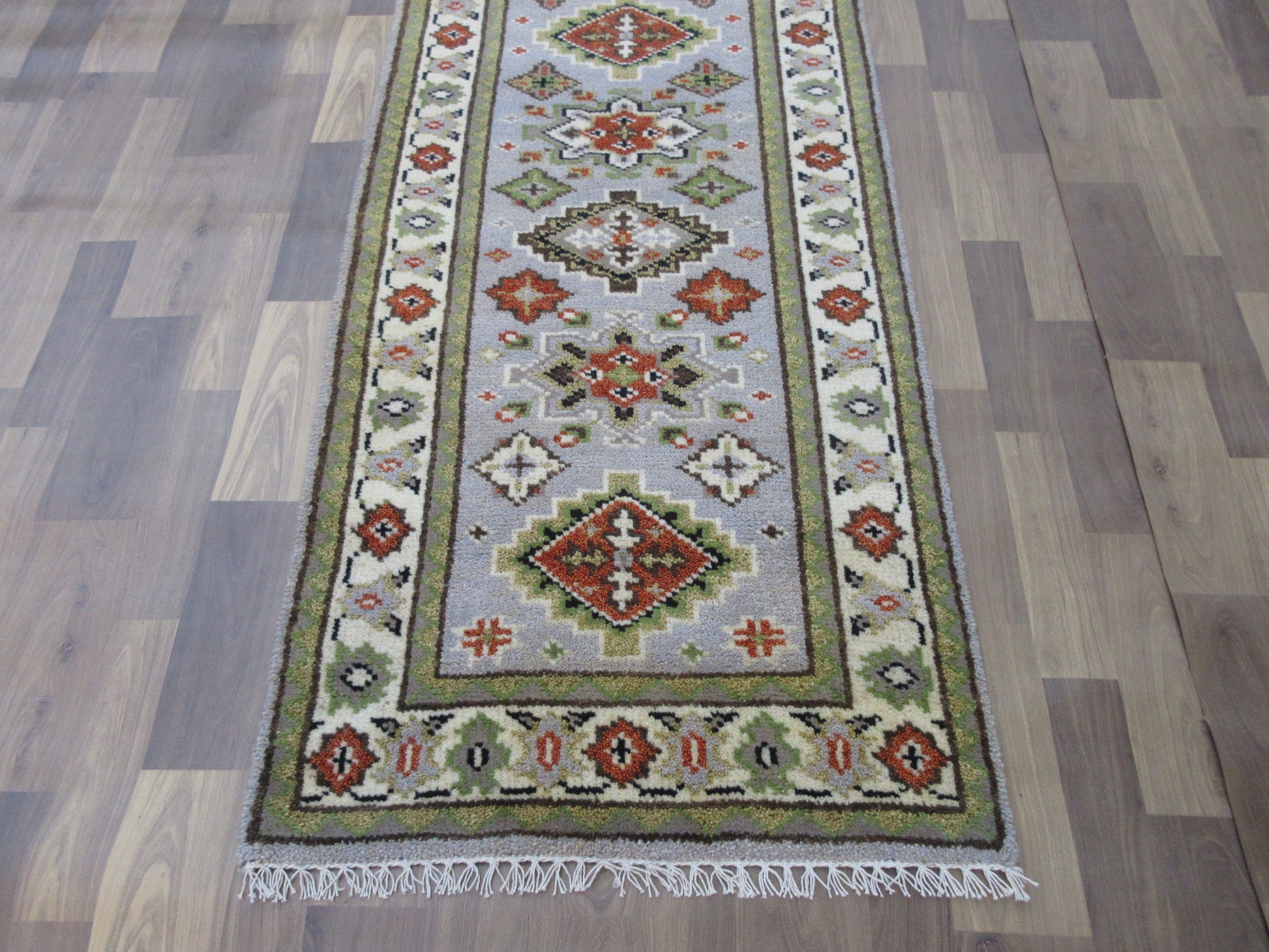 Hand Knotted Kazak Wool Rug 8x2.6ft Blue & Ivory Runner Bedroom Kitchen Carpet
