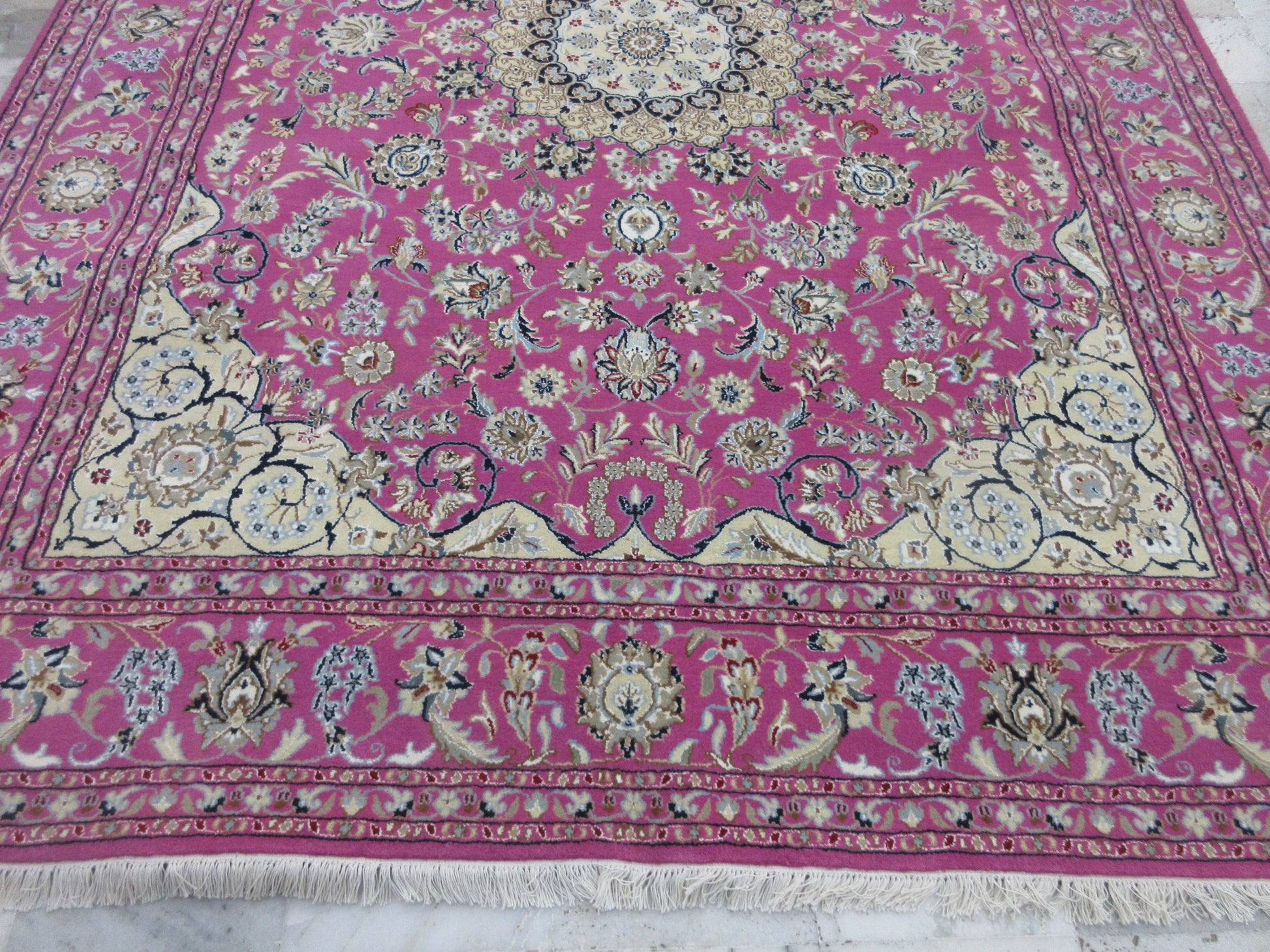 Your home with this Handmade 8x10 Ft Pink Oriental Silk Rug, featuring a Traditional Persian Design. This rug is 100% hand-knotted by expert artisans from the village, ensuring that it is not machine-made. It is a stunning, eye-catching piece of floor art that will elevate the beauty of your living space. The intricate design, vibrant color concept, high-quality materials, and traditional hand-weaving process combine to create a décor element that you'll cherish every time you see it.