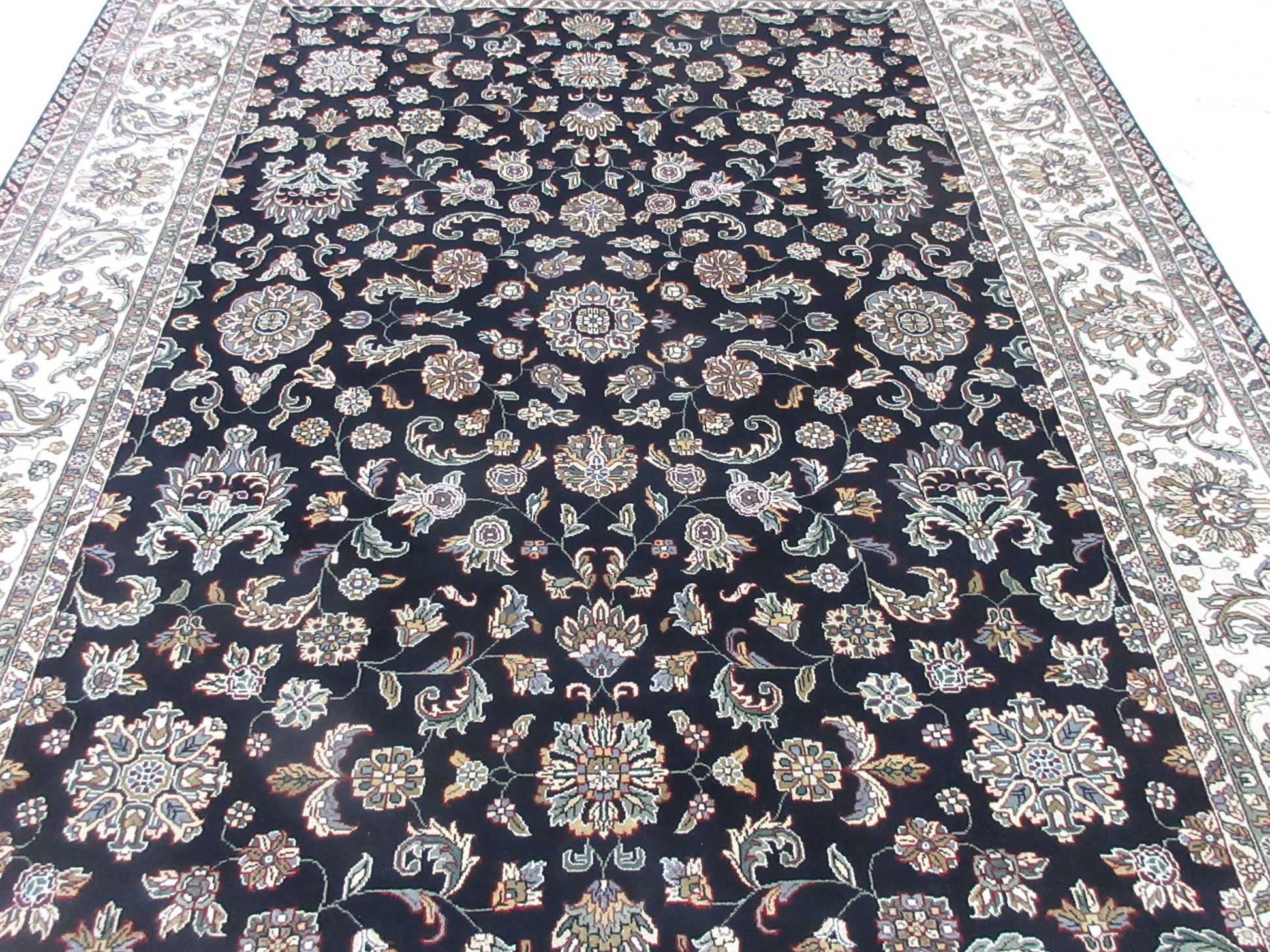 Luxurious Black and Ivory Hand-Knotted 10x8 Feet Persian Silk Rug | Exquisite Persian Design
